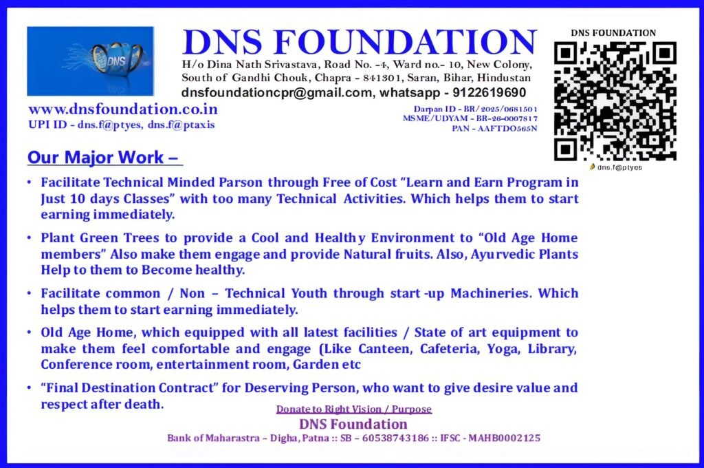 DNS Foundation is committed to empowering individuals, supporting communities, and creating sustainable change through skill development, environmental initiatives, youth empowerment, and social welfare programs. Our work focuses on improving lives, promoting financial independence, and providing care for those in need. Here is a glimpse of the major initiatives we carry out: